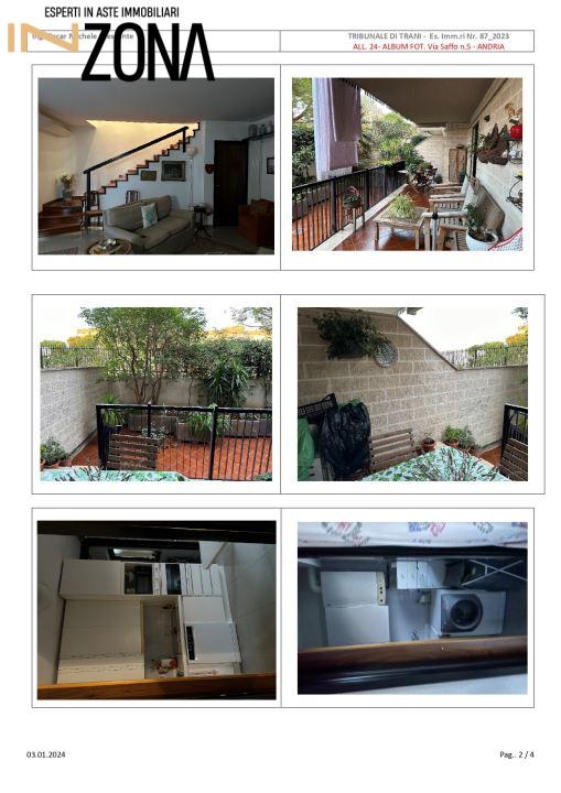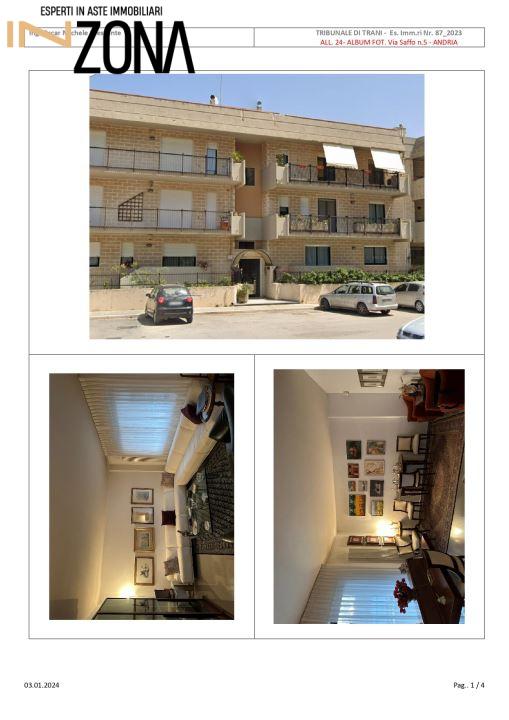 L´ immobile in oggetto consta di un appartamento su due livelli al piano rialzato (o piano terra) e al piano primo, oltre a volumi tecnici al piano copertura (o piano terzo), fanno parte di un edificio condominiale, di 3 piani fuori terra, realizzato con struttura portante intelaiata a pilastri e travi in cemento armato e solai in latero cemento, murature di tompagno con laterizi termici spessore 35 cm. dotato di scala condominiale e di ascensore. Fabbricato costruito tra il 1989 ed il 1991 ubicato nella zona periferica a nord-est della città di Andria, all´immobile si accede dal portone del fabbricato al civico 5 di via Saffo; al piano rialzato è ubicata la zona giorno, composta da ingresso, soggiorno, ripostiglio, tinello, cucina, lavanderia e wc, due balconi uno con affaccio su via Saffo e l´altro sul giardino privato, dai due balconi si accede attraverso una