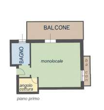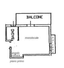 • Piano primo: monolocale, bagno, terrazzo di 12 mq, balcone di 2 mq