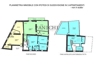 E´ possibile ristrutturare i 2 immobili con l´attuale divisione oppure ristrutturarli scegliendo una suddivisione che va ad aumentare il numero degli appartamenti come da planimetria allegata, potendo sfruttare al massimo la superficie calpestabile e la volumetria, ricavando così 3 appartamenti di cui uno di 50 mq con soggiorno/pranzo, ripostiglio, camera e bagno. Un secondo appartamento di 60 mq. con soggiorno/pranzo, terrazzo, camera matrimoniale e bagno. Un terzo appartamento di 78 mq. su 2 livelli e predisposto per soggiorno/pranzo, 2 camere e bagno, scala di collegamento col soppalco predisposto per soggiorno di piano, bagno, 2 ripostigli e terrazza a tasca sul tetto da dove si accede al ripostiglio sottotetto.