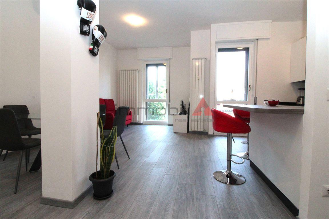 Monza zona S. Albino. In palazzina proponiamo luminoso ed ampio appartamento di 2 locali di 75mq composto da ingresso, ampio soggiorno con cucina a vista e balcone, ripostiglio/guardaroba con attacco lavatrice, disimpegno notte con ampia camera da letto, bagno con doccia. Riscaldamento centralizzato a gestione autonoma. Completa la soluzione la cantina e la spaziosa autorimessa. Posto moto condominiale.