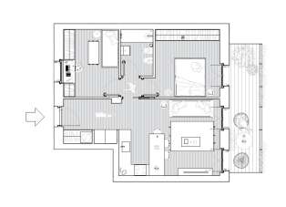 L´appartamento B3.3 è una soluzione sita al terzo piano di 4 di ca. 78 mq ed è composta da una spaziosa zona living con cucina a vista e accesso al terrazzino, disimpegno, due camere da letto e servizi.