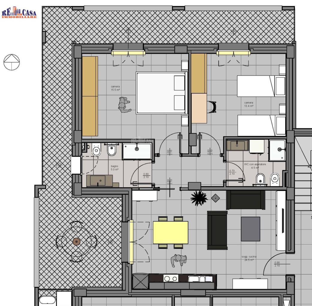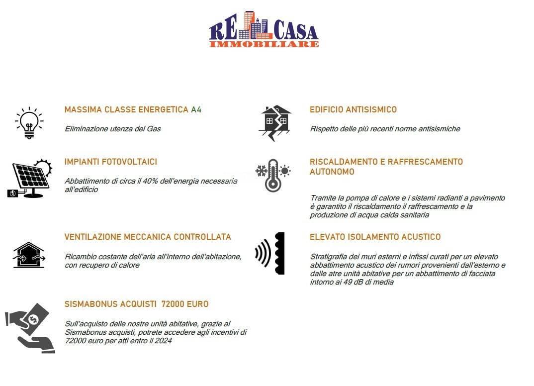 L´agenzia Re Casa Immobiliare propone in vendita appartamento di nuova costruzione a Grottammare, provincia di Ascoli Piceno, in zona centrale e servita. Appartamento di mq 82 al piano secondo realizzato in classe energetica A4, composto da ampio soggiorno con angolo cottura, due camere da letto matrimoniali, due bagni con doccia di cui uno con finestra ed altro con aerazione forzata, terrazzo abitabile di 13 mq e balcone perimetrale di mq 22. Esposizione Nord-Ovest. Disponibilit di acquisto di box auto di varie metrature, posto auto e/o fondaco con prezzo da computare a parte. Consegna prevista per settembre/ottobre 2024. Il fabbricato verr realizzato con i migliori standard qualitativi quali riscaldamento e raffrescamento autonomo tramite pompa di calore anche per la produzione di acqua calda sanitaria, ventilazione meccanica controllata con recupero di calore e impianto insonorizzato, tapparelle coibentate e motorizzate con cassonetto a scomparsa, finestre in PVC con doppio vetro termoacustico. Altissimo isolamento acustico 46 dB di media Sisma bonus pari ad Euro 72.000 entro il 31/12/2024, che il cliente potr portare in detrazione. - SC9063295