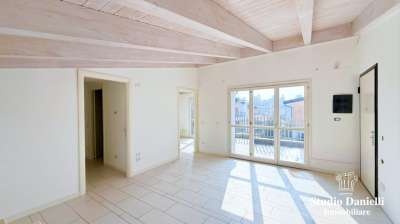 In palazzina di recente costruzione, trilocale con splendide TRAVI A VISTA in legno sbiancato, sito all´ULTIMO PIANO con TERRAZZO. La soluzione è composta da zona giorno con accesso al terrazzo collegato alla CUCINA semi ABITABILE, disimpegno, camera matrimoniale con vasca e cabina armadio, seconda camera di ampie dimensioni, bagno padronale e lavanderia. \nLa soluzione si presenta in buone condizioni con serramenti in legno con doppio vetro, riscaldamento a pavimento centralizzato a gestione autonoma. Cantina inclusa nel prezzo e possibilità di acquisto BOX di 25mq (prezzo a parte and euro; 18.000,00) o POSTO AUTO COPERTO ( and euro; 9.000,00).\n\nLIBERO SUBITO.\n\nPur ubicato a due passi dal centro, comodo con tutti i servizi (stazione ferroviaria inclusa) raggiungibili a piedi, la zona è tranquilla ed in particolar modo la zona notte gode di un affaccio riservato.\n\nLe spese condominiali ammontano a ca 110 and euro; mensili oltre spese di riscaldamento ed acqua.\n\nContattaci al 320.3045331 (anche via sms o whatsapp) per ulteriori info o per un appuntamento!!! Tutte le informazioni qui fornite sono da ritenersi puramente indicative e non costituiscono in alcun modo elemento contrattuale. I dati relativi alle superfici sono approssimative , non hanno valore contrattuale e non sono in alcun modo vincolanti nella trattativa di vendita. I beni vengono venduti o affittati a corpo e non a misura. - Maggiori Dettagli: Porta blindata, Persiane, Doppi vetri, Videocitofono , Serramenti in alluminio , Riscaldamento a pavimento