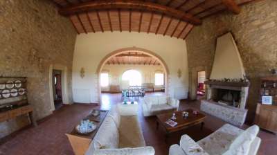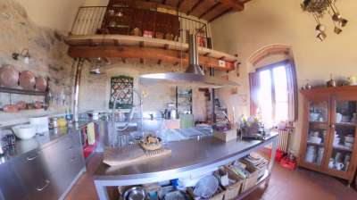 Il fabbricato principale è formato da un casale di circa mq. 550 distribuito su due livelli e composto al piano terra da locale deposito/lavanderia con accesso autonomo dalla corte, locali soggiorno-pranzo, camera, bagno finestrato e disimpegno con accesso agli attigui locali magazzino facenti funzione salone, disimpegno, camera matrimoniale, garage e bagno finestrato; al piano primo con accesso per tramite scala esterna rivestita in travertino e portico/ballatoio d´ingresso è composto da bellissimo salone pranzo doppio con ampie luci e finestre e dotato di imponente camino, cucina padronale, studio/salotto, bagno finestrato, due camere di cui una dotata di camino con soppalco, bagno e cabina armadio.