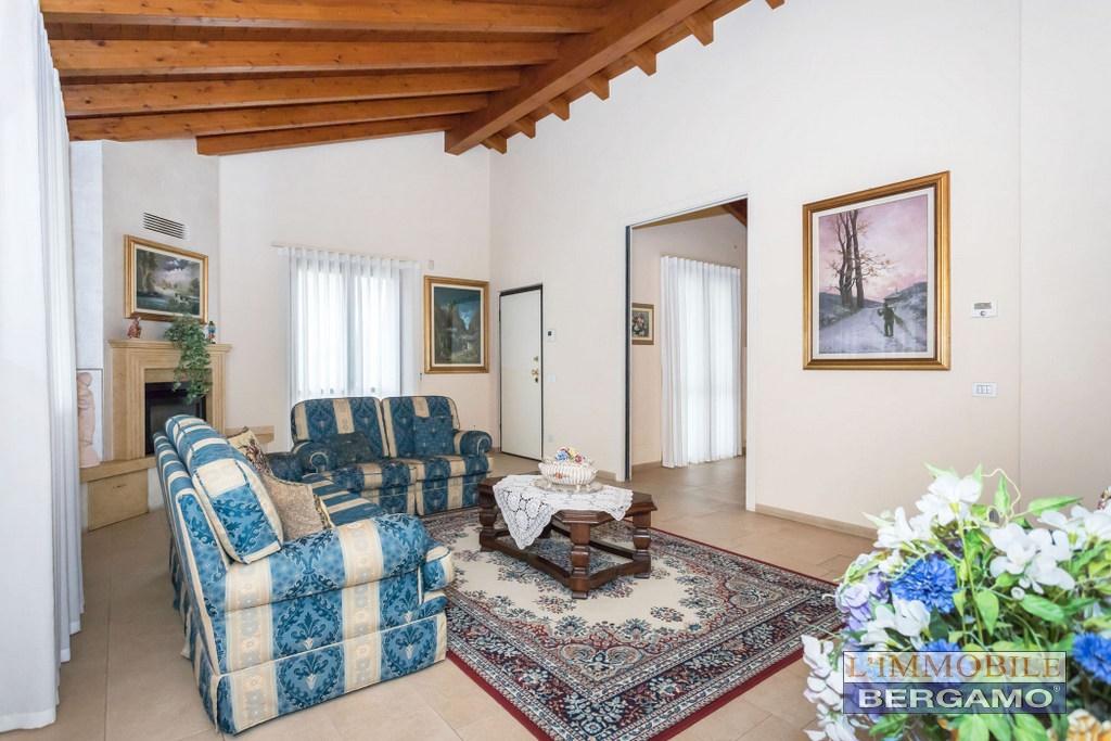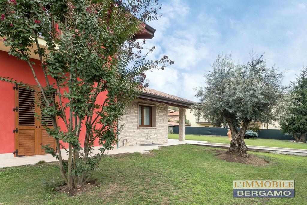 A pochi km da Bergamo nel comune di Mozzo a due passi dal centro nel verde in contesto residenziale pedicollinare di sole ville proponiamo residenza con bellissimo giardino in piano molto fruibile, composta al piano terra dal soggiorno con camino angolare in pietra, cucina abitabile, disimpegno notte, due camere matrimoniali e bagno. Salendo da una comoda scala si arriva al primo piano con una camera matrimoniale di 27 mq comprensiva di cabina armadio, un grande bagno con vasca e doccia e due balconi. Scendendo nel piano interrato troviamo una taverna di 44 mq, locale studio e passaggio diretto all´autorimessa di 69 mq utile per 3/4 auto. Finiture di qualità: gress porcellanato chiaro in tutta la casa, serramenti in pvc con doppi vetri, antoni in pvc chiusi con lamelle orientabili, portoncino blindato, predisposizione impianto di allarme volumetrico e perimetrale, basculante motorizzata e travi a vista in tutto il primo piano. 790.000 trattabili. Gestione permuta Classe Energetica: B - IPE: 99.89kWh/mq anno