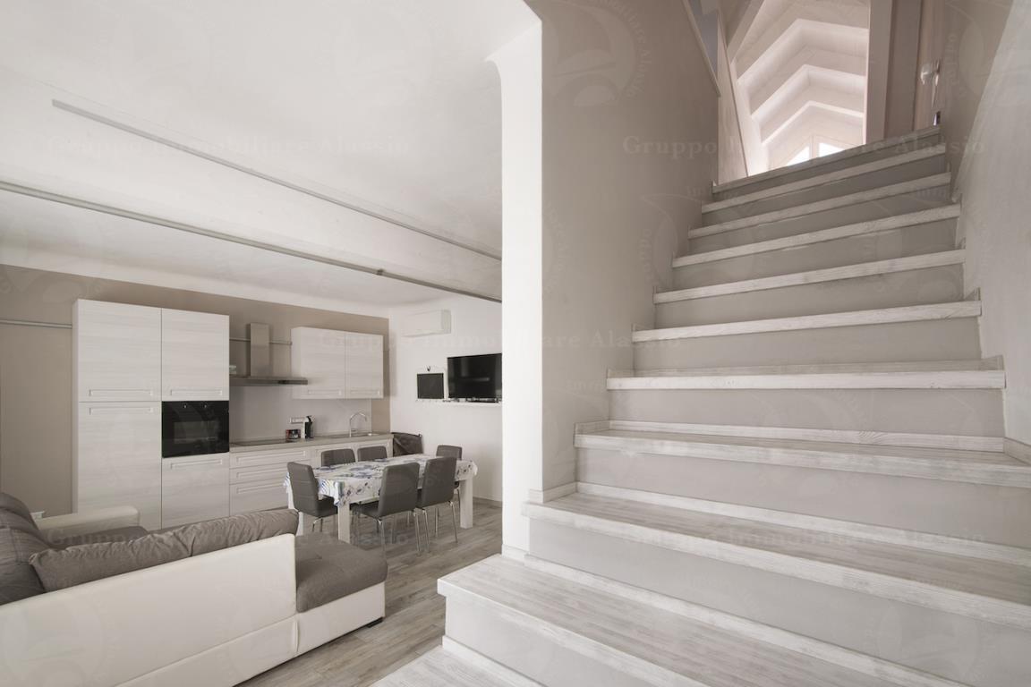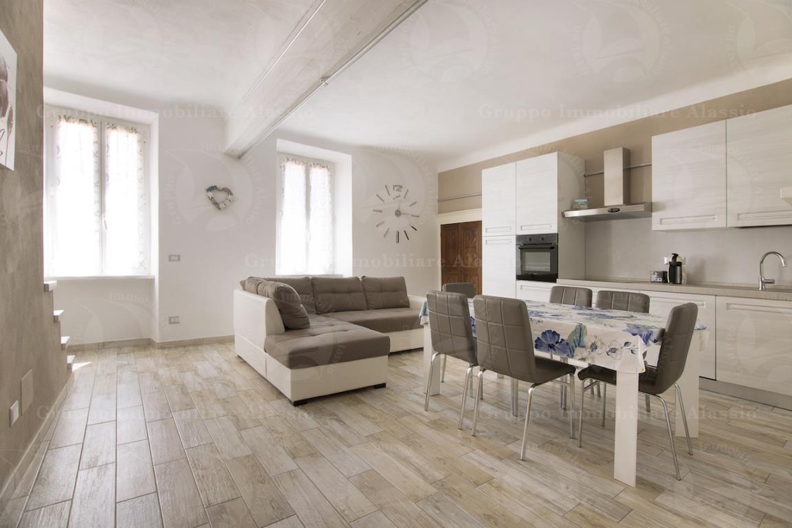 Alassio, luminoso appartamento totalmente ristrutturato e arredato, su due livelli. Secondo piano, ingresso living dove troviamo ampio salone con angolo cottura, grande bagno con doccia e finestra, grande camera matrimoniale, scala interna per immensa camera con bagno e terrazzino. Gli interventi di ristrutturazione sono stati fatti anche sul tetto, coibentandolo, sostituendo la piccola travatura e risanando il trave principale antico e originale. Non vi è condominio, essendo una scala con soli 2 immobili. Accesso dal famoso Budello, quindi a 20 metri dal mare. Classe Energetica: D - IPE: 85.04kWh/mq anno