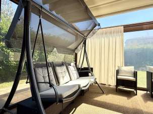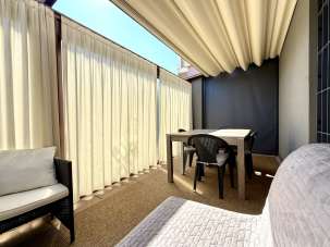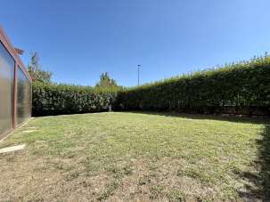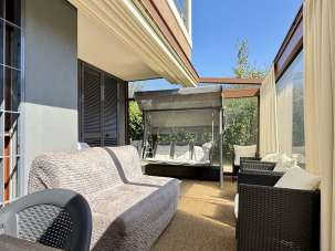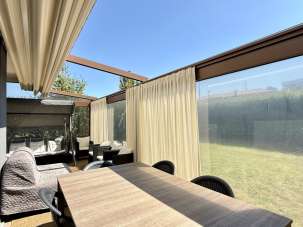 Al pian terreno: ampio living con cucina in nicchia ed accesso alla pergotenda ad apertura completamente meccanizzata - piacevolissima estensione della sala sul giardino privato di circa 300 mq -, due camere da letto, ripostiglio e bagno.