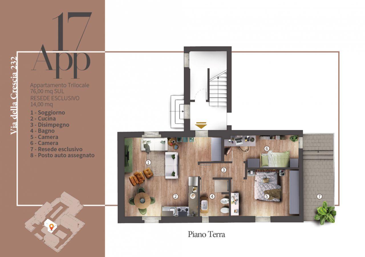 Nel dettaglio l´unità nr. 17 è un ampio trilocale composto da : soggiorno / cucina, due camere ( di cui una matrimoniale ) e bagno finestrato ; completano la proprietà una resede esclusiva ( circa 14 mq ) e un posto auto assegnato .