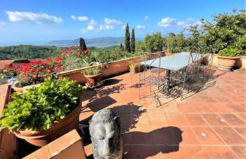 L´esterno del piano terra è caratterizzato da ampie corti e terrazze in cotto fiorentino che affacciano sul giardino, arredati per cene all´aperto, salotti da esterno per godere la splendida vista del mare e delle colline, barbecue e forno, pergolo e porticato.