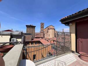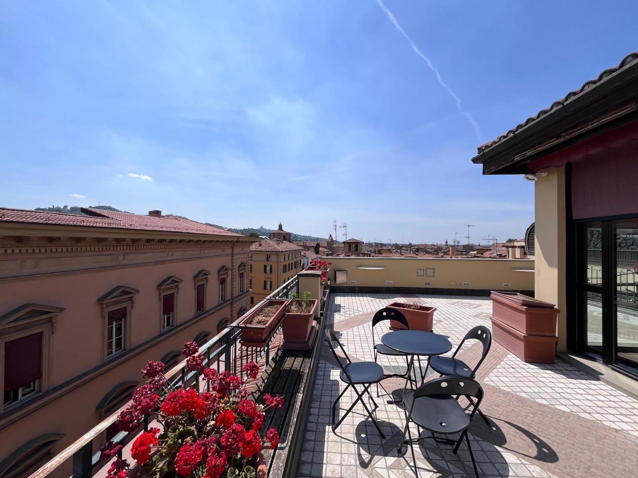 In palazzo storico con ascensore attico completamente arredato con terrazzino al piano e panoramica terrazza di 60 mq. al piano superiore con vista unica su Bologna. L´appartamento si dispone su due livelli: ingresso su sala con zona cottura, camera matrimoniale, doppi servizi, al piano superiore ulteriore studio con possibilità seconda camera con affacci sulla terrazza. Tre ripostigli, termo autonomo, climatizzazione. No property manager