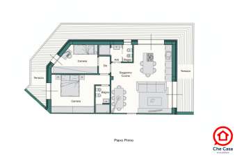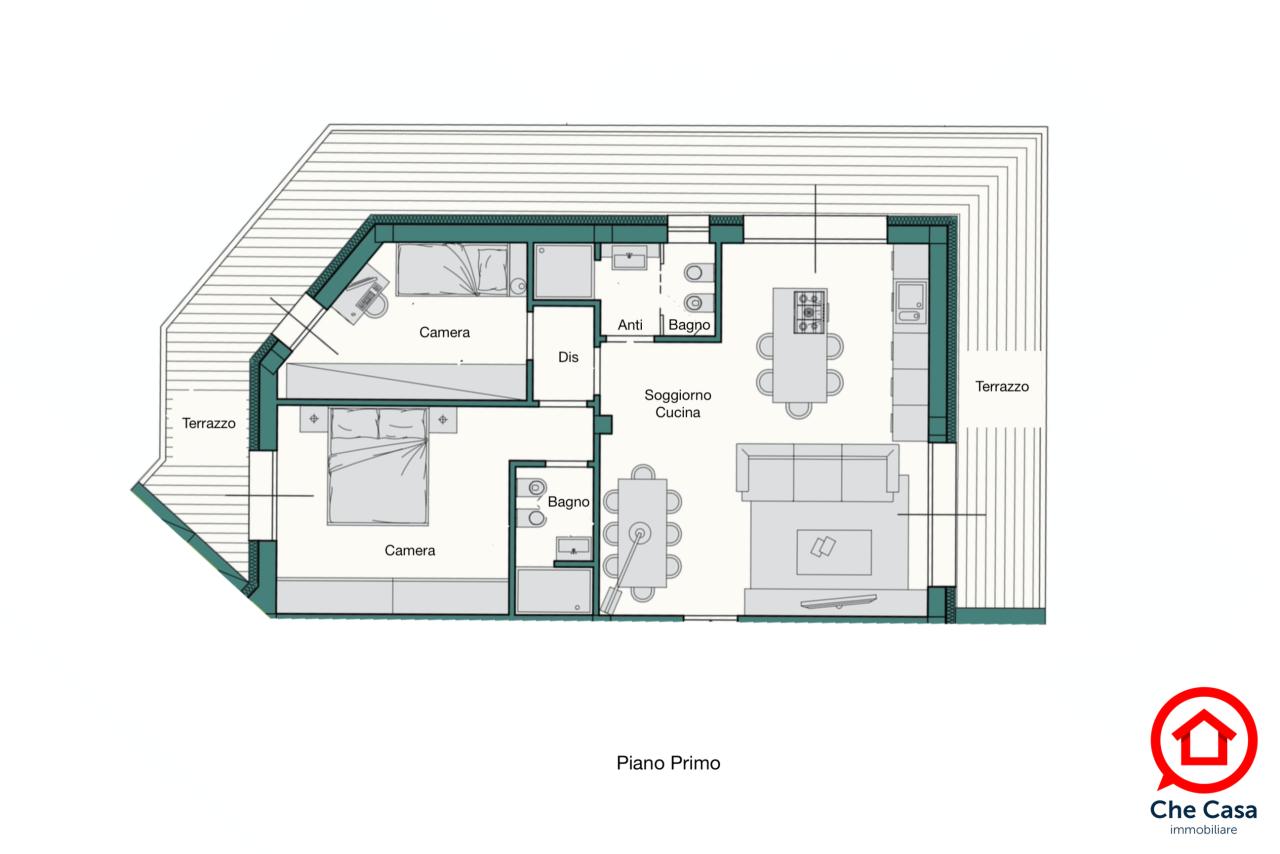 L’unità A6 è un trilocale caratterizzato da un esposizione su tre lati, zona giorno a sud ed a est e, per ultimo ma non per importanza, un grande terrazzo di 35 mq che abbraccia interamente la soluzione. Internamente troviamo una una comoda zona giorno di oltre 30 mq calpestabili, due camere da letto e due bagni. Tutti gli ambienti aprono sul terrazzo.