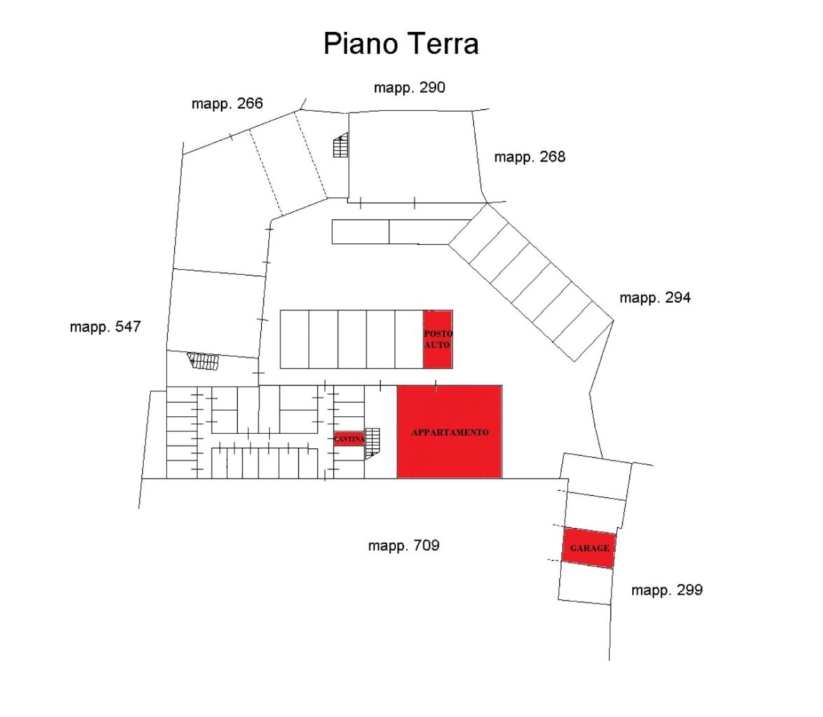 Appartamento al PIANO TERRA all´interno di una corte tranquilla, composto da soggiorno/cottura - due ampie camere da letto - disimpegno - bagno - lavanderia - cantina - posto auto e garage.
