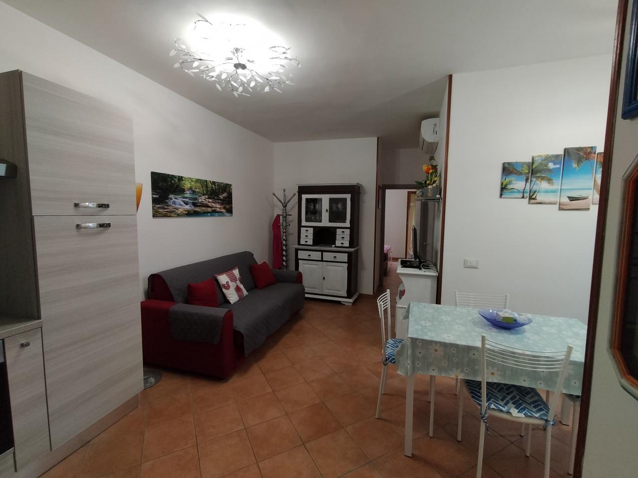 Appartamento al piano terra con giardino, composto da soggiorno con divano letto e angolo cottura, camera matrimoniale con accesso alla terrazza chiusa, piccola camerina con un lettino, bagno con doccia. Corte privata con doccia esterna.