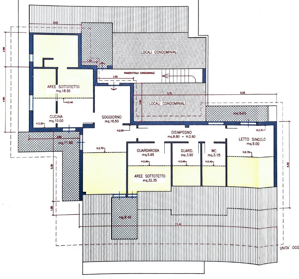 La mansarda, ubicata al sesto piano con ascensore che arriva fino al quinto, è composta da una zona living con ampio salotto, cucinotto con zona pranzo e doppio servizio/lavanderia; la zona notte è composta da tre camere da letto e bagno.