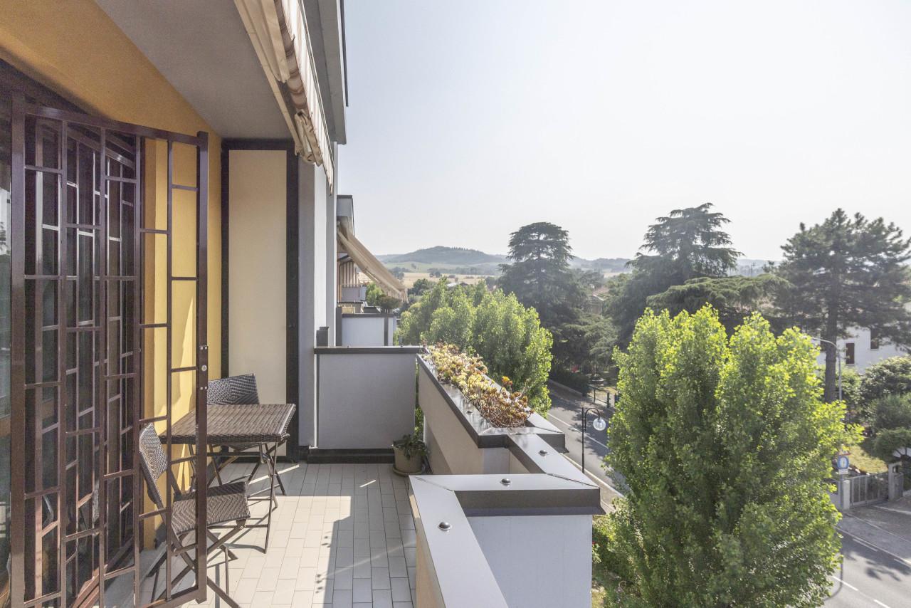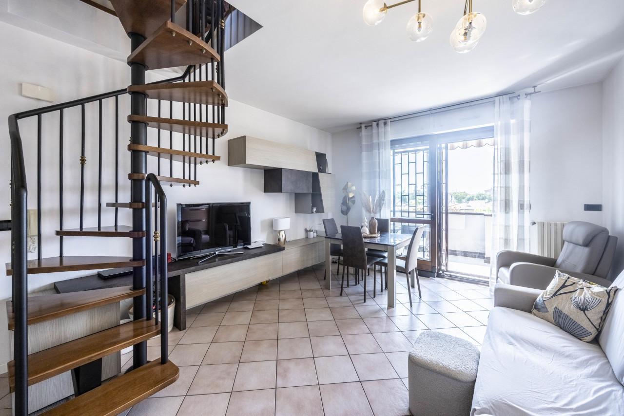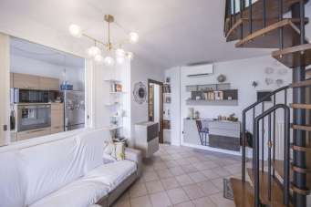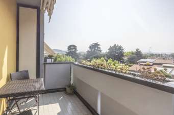 Splendida localizzazione ai piedi delle colline, in posizione centralissima, al contempo comoda ad ogni servizio (centro commerciale, scuole, sport e benessere, pista ciclopedonale, autobus) ed in un contesto verde e silenzioso, con pochi eguali. Particolarissimo ultimo piano su due livelli, estremamente luminoso, con triplo affaccio e sostanzialmente privo di alloggi confinanti. Sala con cucina ´´in affaccio´´ e loggia panoramica mq 10, due camere da letto, di cui la più ampia con ulteriore loggia e due bagni. Al piano sovrastante - con accesso dalla sala - grande vano mansardato con meraviglioso terrazzo di mq 21 in proprietà esclusiva e parzialmente coperto. Da vedere! Riscaldamento autonomo e aria condizionata. Autorimessa di mq 19 compresa nel prezzo. Euro 375´000.00. Rif. COM043