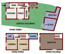Al piano terra ingresso sul soggiorno, sala da pranzo, cucinotto, ripostiglio e locale tecnico; al primo piano bagno, due camere matrimoniali ed uno studio.