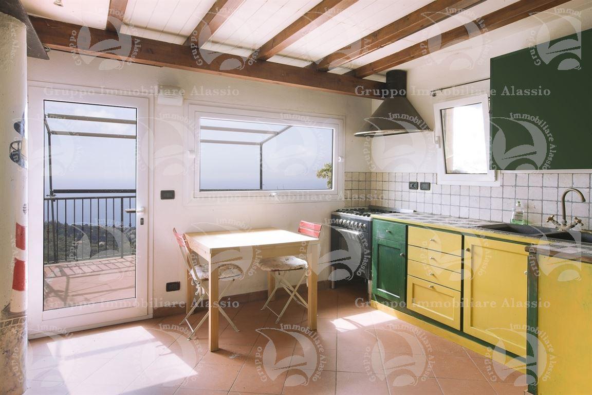 Alassio, sulla collina, zona di Vegliasco, viene proposta una villa su più livelli. Nasce come antico rustico in pietra, totalmente recuperato, negli anni 1981/82, mantenendo l´architettura e i materiali dell´epoca e principalmente la pietra a vista lavorata tutta a ´´faccia a vista´´, totalmente scagliata e dove non si doveva lasciar vedere il cemento usato per rinforzarla. Siamo a quota 402 s.l.m. dalla quale si ammira una stupenda vista del golfo di Alassio e baciata dal sole, che nasce dal mare, sin dai primi minuti della giornata. Da ogni angolo della villa, si ammira la meraviglia della collina sino al mare.
