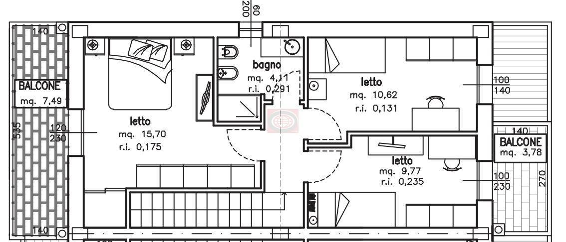 - PIANO PRIMO: disimpegno, 3 camere letto (mq 15,70 + 10,50 + 10), bagno e due balconi.