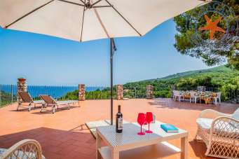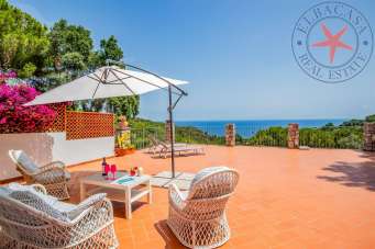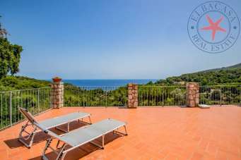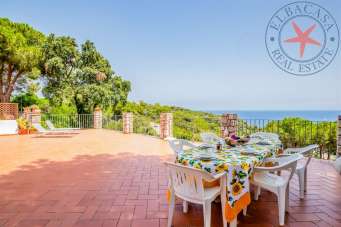 Villa libera su tre lati di recente costruzione e disposta su tre livelli. Al piano terreno c´è un ampio soggiorno con cucina a vista , tre camere, un bagno, terrazza con lavanderia; al piano superiore c´è un´ altra camera ed un bagno mentre al piano seminterrato si trova un piccolo appartamento indipendente composto da un soggiorno-cucina, una camera matrimoniale ed un bagno. Entrambi gli appartamenti godono di una bellissima ed ampia terrazza vista mare. La proprietà è immersa in una pineta di circa 3300 mq in una zona molto verde e tranquilla. Il mare è raggiungibile in pochi minuti a piedi .